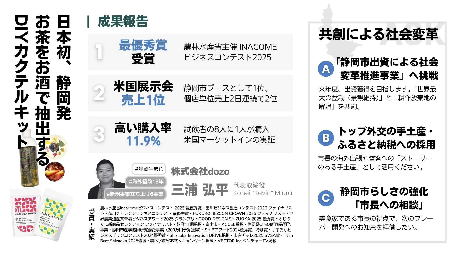本訪問は、公益社団法人世界緑茶協会およびChaOIフォーラムのご協力のもと実現しました。弊社が取り組む、静岡県産の希少な茶葉とお酒を組み合わせたクラフトティーカクテルキット「ZEN TEA BREW」の事業内容と成果をご報告するとともに、静岡市との共創の可能性についてお話しさせていただきました。